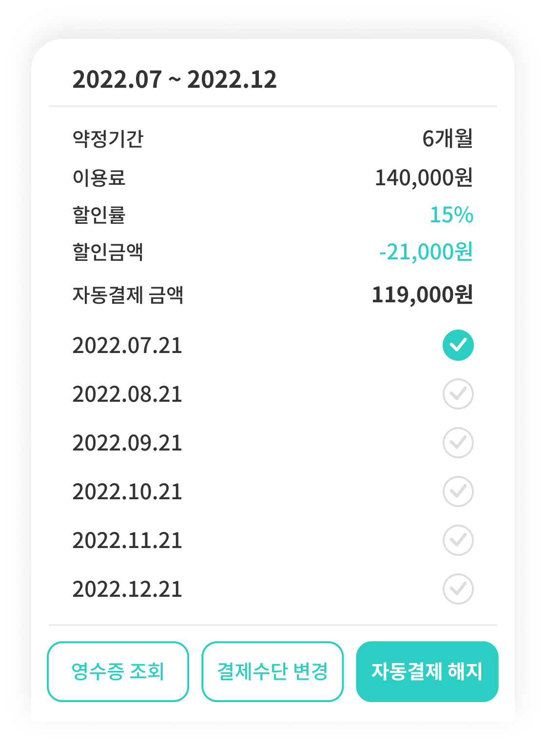 매달 정확한 날짜에 안전하게 자동결제가 이루어져요.